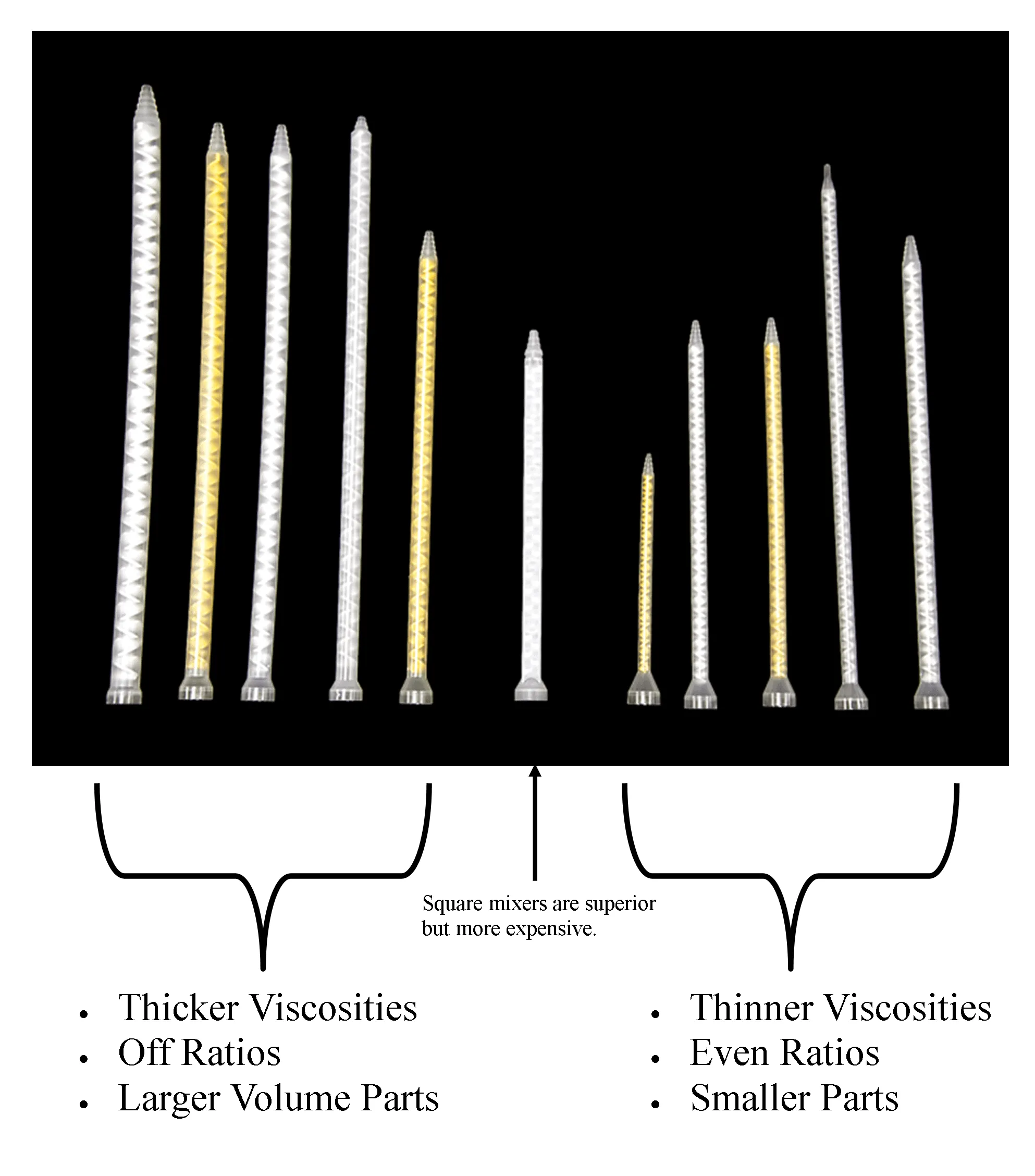 The diagram above shows a small fraction of the static mixers available. The visible differences include the diameter of the mixer, length, number of internal elements, shape and color, which denotes the material that the elements are made of.